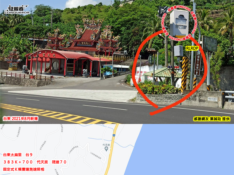 首頁 > 最新訊息 > 台東太麻里 台9 383.7K 代天宮 限速70 固定式K頻雷達測速照相